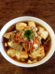 5.焼いてカリカリした豆腐に、熱々のキノコあんをかけます。