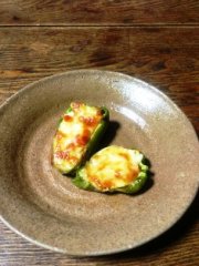 5.4をピーマンに入れ、チーズを乗っけて、オーブントースターでこんがり焼き色がつくまで焼けたら出来上がりです!